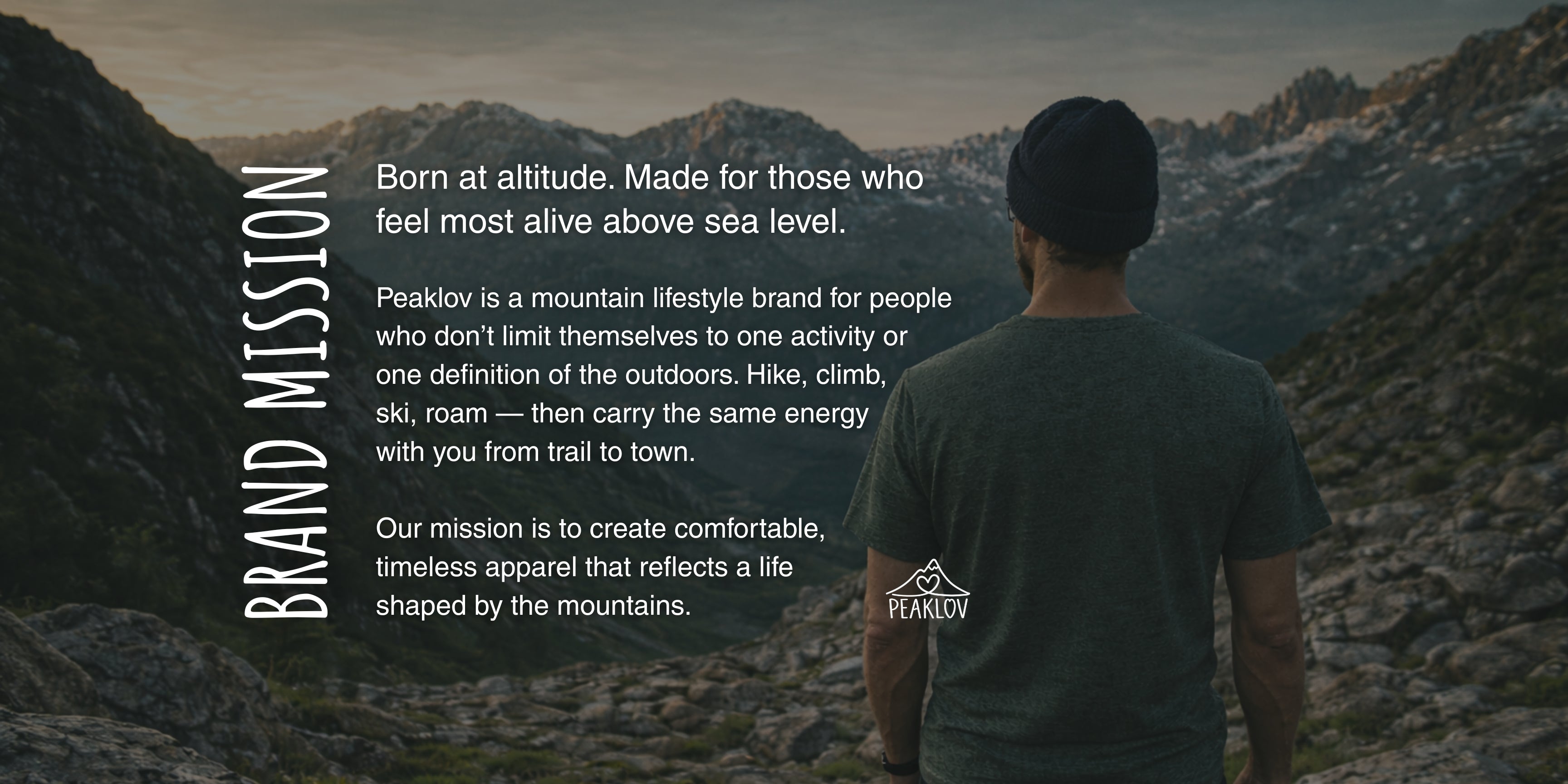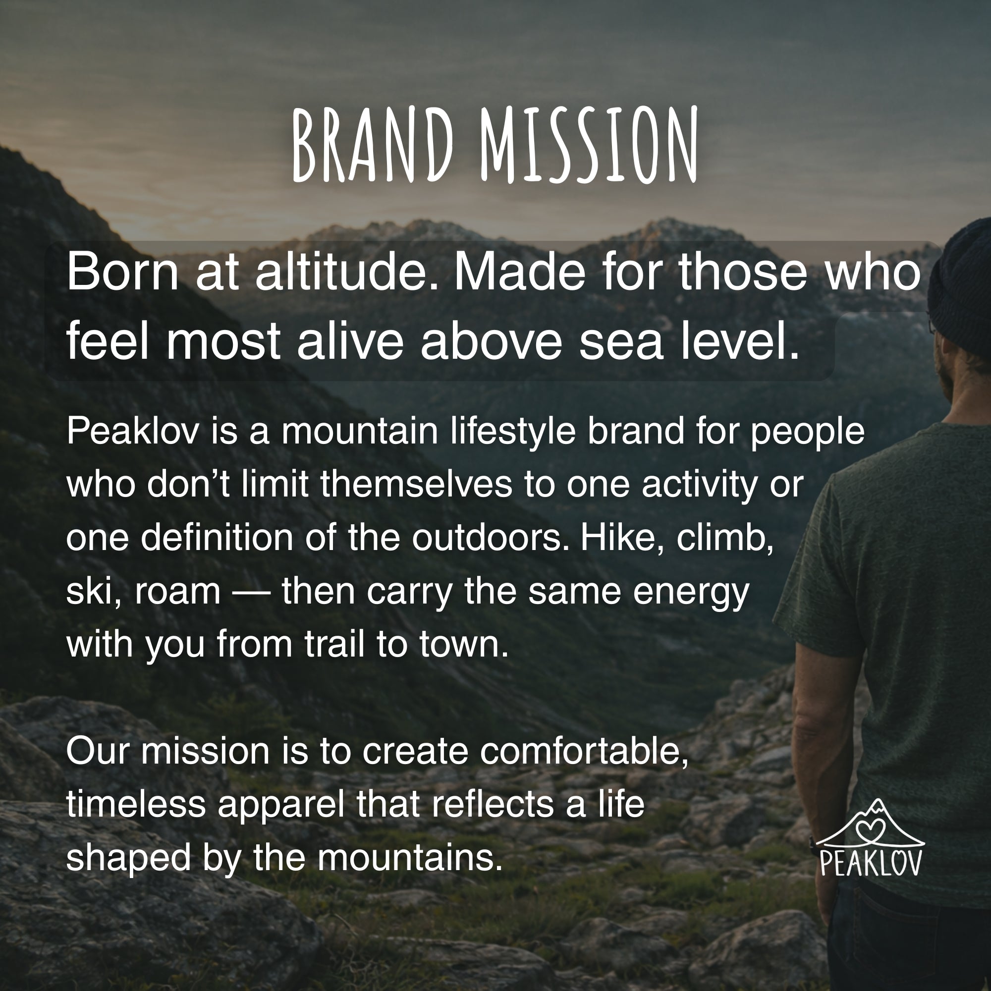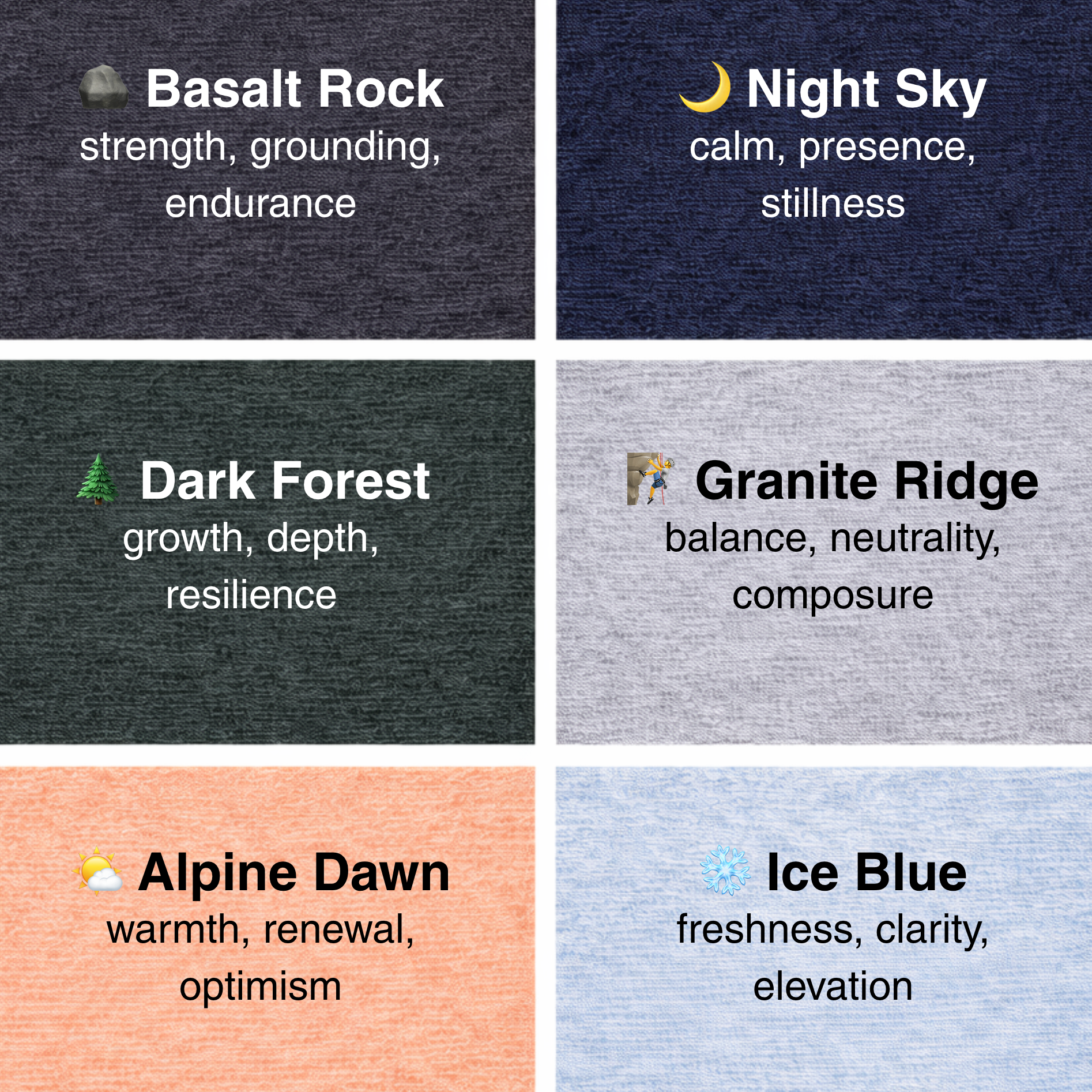 Peaklov's t-shirt colors are drawn directly from the mountains — from rock, forest, air, and light. Each shade is grounded in a real mountain element and chosen with intention.